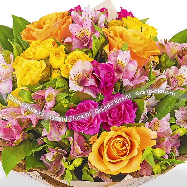 Стандартный: оранжевая роза - 3 шт, кустовая розовая роза - 2 шт, альстромерия розовая - 5 шт,